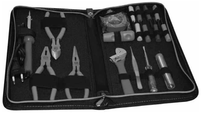 Рис. 1.14. Комплект для пайкиПаяльные принадлежности, кроме этого стандартного набора, должны включать в себя отсос для припоя и заземляющий браслет для снятия статического электричества. Паяльник также должен иметь заземление. - Клещи обжимные (рис. 1.15) необходимы для монтажа коннекторов (например стандарта RJ-45) на кабель, используемый при прокладке локальных вычислительных сетей (ЛВС).