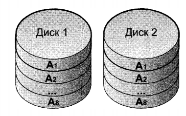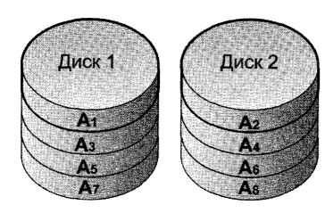 RAID О. Обычно в состав RAID 0 входят два или более жестких дисков. При записи файла его содержимое разбивается на несколько блоков, которые одновременно записываются на жесткие диски (рис. 3.1). Например, пусть имеется массив RAID 0, состоящий из двух дисков, и файл, который при записи разбивается операционной системой или контроллером на восемь блоков А1-А8. Тогда при первом такте происходит одновременная запись блока А1 на первый диск, а блока А2 — на второй. При втором такте производится запись блока АЗ на первый диск, а блока А4 — на второй, и т. д. Процесс чтения производится аналогично. Благодаря такому «распараллеливанию» существенно возрастает производительность, которая прямо пропорциональна количеству дисков в массиве. Однако при этом существенно снижается надежность хранения информации, так как неисправность одного из дисков приводит к полной ее утрате.