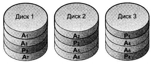 Структура массива RAID 5 (рис. 3.3) состоит как минимум из трех дисков, на которых равномерно распределены собственно информация и ее блоки четности. В процессе записи файла при первом такте происходит запись блока А1 на первый диск, А2 — на второй диск, а на третий диск производится запись блока четности Р1, представляющего собой результат обработки блоков А1 и А2. Во время второго такта происходит запись блока АЗ на первый диск, А4 — на третий диск, а на второй диск производится запись блока четности Р2. Во время третьего такта происходит запись блока А5 на второй диск, А6 — на третий диск, а на первый диск производится запись блока четности РЗ. Роль блока четности состоит в том, что по нему и по одному из имеющихся блоков информации можно восстановить утраченный блок. Например, при наличии блоков А2 и Р1 можно восстановить информацию из блока А1.Таким образом, при записи информации на RAID 5 тратятся дополнительные ресурсы для вычисления блоков четности, но зато при чтении имеется выигрыш, по сравнению с отдельным диском, из-за распараллеливания процесса.