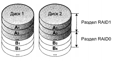 В настоящее время получает распространение технологияMatrix RAID (рис. 3.4), реализованная фирмой Intel в своих чипсетах начиная с ICH6R. Строго говоря, она не является новым уровнем RAID, а лишь позволяет, используя всего два диска, организовать одновременно один или несколько массивов уровня RAID 1 и один или несколько массивов уровня RAID 0. Таким образом, появилась возможность за сравнительно небольшие деньги обеспечить для одних данных повышенную надежность, а для других — высокую скорость доступа.При реализации RAID можно применять не только аппаратные средства, но и полностью программные компоненты (драйверы). Например, в системах на ядре ОС Linux существуют специальные модули ядра. В операционных системах Windows поддерживается программный RAID О, RAID 1 и RAID 5.